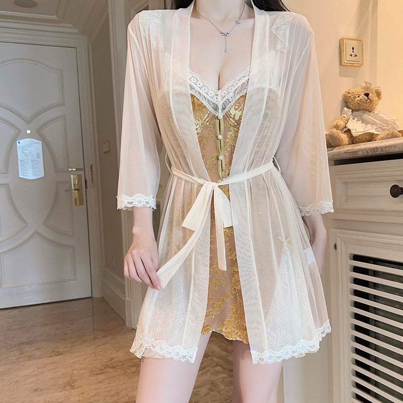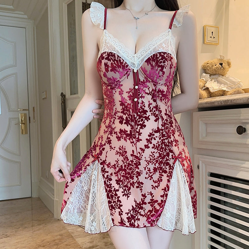 Velvet Floral Lingerie Set with Sheer Lace & Padded Slip Dress